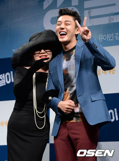 배우 김해숙과 유아인이 포토타임을 하고 있다.
