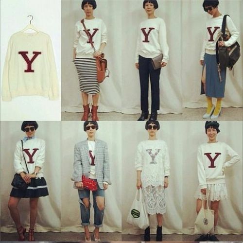 사진 속 김나영은 같은 티셔츠를 어떻게 입느냐에 따라 다를 수 있다는 것을 보여주고 있다. 상의는 같지만 하의와 가방을 달리 선택해 일주일 패션을 완성했다.