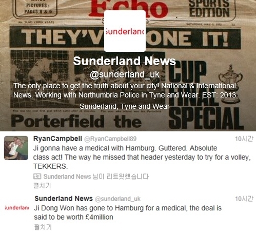 선덜랜드 뉴스는 2일(한국시간) 트위터를 통해 "지동원이 메디컬테스트를 받기 위해 함부르크로 갔다. 400만 파운드(약 68억 원)의 가치가 있는 것으로 전해졌다"고 밝혔다.
