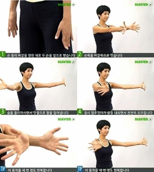'화가 치밀 때 좋은 체조'는 두 손을 앞으로 뻗어 손바닥을 마주한 후 손목을 바깥쪽으로 꺾어주며 숨을 들이쉰다. 팔을 벌려 숨을 내쉬며 두 팔을 오므려주는 동작을 반복하면 된다.