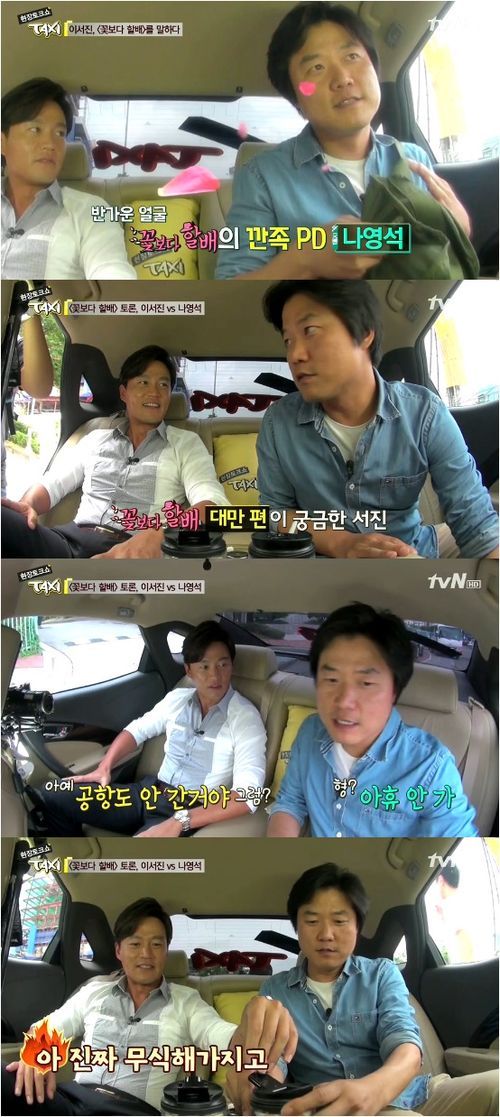 두 사람의 만남은 ‘꽃보다 할배’에서 티격태격하는 것과 다르지 않았다. 편집으로 바쁜 나영석 PD를 데리러 상암으로 가게 되자 이서진은 “지가 왜 오라고 난리야”, “빨리 타”라면서 구시렁거렸다.