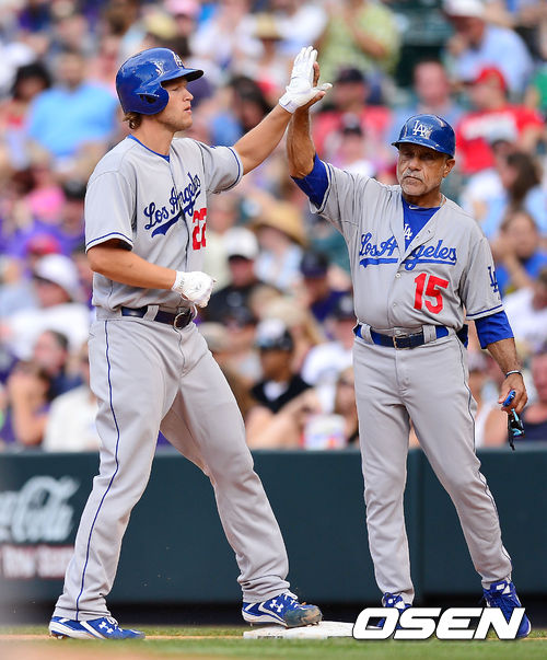 3일 (이하 한국시간) 미국 콜로라도주 덴버 쿠어스 필드에서 열린 2013 메이저리그 콜로라도 로키스와 LA 다저스의 경기, 5회초 2사 주자 2,3루 다저스 커쇼가 타석에서 역전 2타점 적시타를 날린 후 1루에서 기뻐하고 있다.