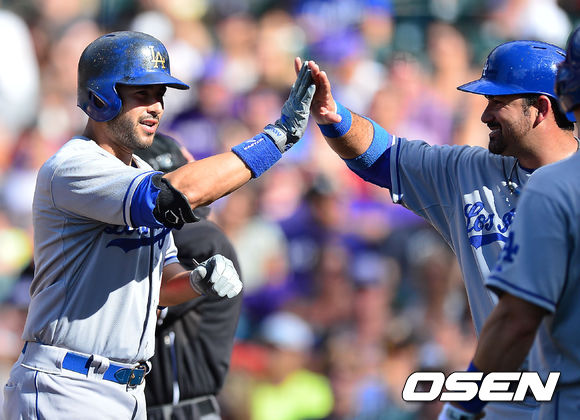 3일 (이하 한국시간) 미국 콜로라도주 덴버 쿠어스 필드에서 열린 2013 메이저리그 콜로라도 로키스와 LA 다저스의 경기, 6회초 1사 주자 1루 다저스 이디어가 우월 투런 홈런을 날린 후 홈에서 선행주자 곤살레스와 하이파이브를 하고 있다.