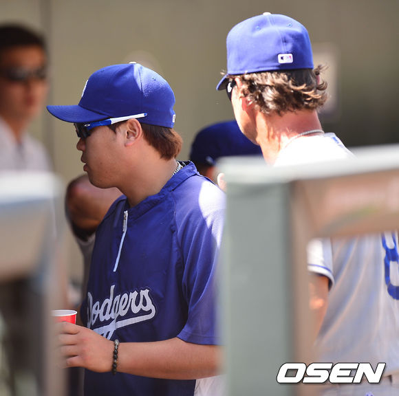 3일 (이하 한국시간) 미국 콜로라도주 덴버 쿠어스 필드에서 열린 2013 메이저리그 콜로라도 로키스와 LA 다저스의 경기, 덕아웃에서 돈 매팅리 감독이 류현진의 어깨를 치고 있다.