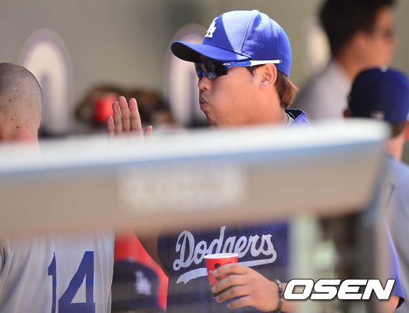 3일 (이하 한국시간) 미국 콜로라도주 덴버 쿠어스 필드에서 열린 2013 메이저리그 콜로라도 로키스와 LA 다저스의 경기, 덕아웃에서 다저스 류현진이 간식을 먹으며 동료들과 인사를 나누고 있다.