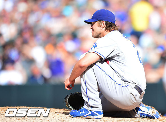 5회말 1사 주자 1루 콜로라도 아레나도에게 좌중전 1타점 2루타를 맞은 다저스 선발 커쇼가 마운드 위에서 주저앉고 있다. / rumi@osen.co.kr