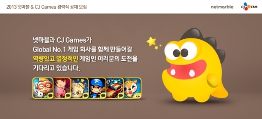 CJ E&M 넷마블(이하 넷마블)과 CJ 게임즈(산하 자회사- 씨드나인게임즈, 누리엔소프트, ST플레이, 애니파크, CJ게임랩, 턴온게임즈, 블루페퍼, CJIG)는 ‘2013년 경력직’ 공개 채용을 대규모로 실시한다.