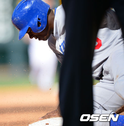 6회초 무사 주자 1루 다저스 곤살레스의 우전 안타때 1루 주자 푸이그가 3루에 몸을 날리며 세이프되었으나 고통스러워하고 있다. / rumi@osen.co.kr