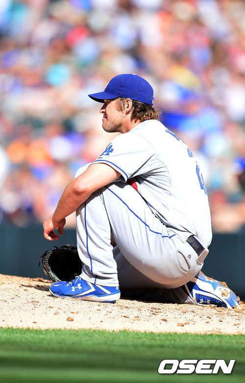 5회말 1사 주자 1루 콜로라도 아레나도에게 좌중전 1타점 2루타를 맞은 다저스 선발 커쇼가 마운드 위에서 주저앉고 있다. / rumi@osen.co.kr