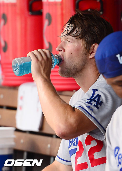 5회를 마친 다저스 커쇼가 덕아웃에서 음료를 마시고 있다. / rumi@osen.co.kr