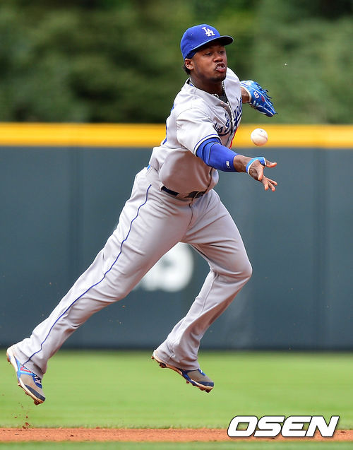1회말 무사 주자 1,3루 콜로라도의 아레나도의 유격수 병살타때 다저스 유격수 라미레스가 몸을 날리며 병살처리를 하고 있다. / rumi@osen.co.kr