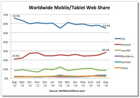 넷어플리케이션의 8월 조사에 따르면, 애플의 iOS는 8월 웹점유율이 54.9%로 지난해 8월보다 11%p나 하락했다.