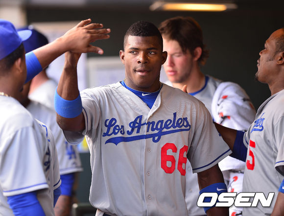 6회초 무사 주자 1,3루 다저스 라미레스의 중견수 희생플라이때 홈을 밟은 푸이그가 덕아웃에서 동료들과 하이파이브를 하고 있다. / rumi@osen.co.kr