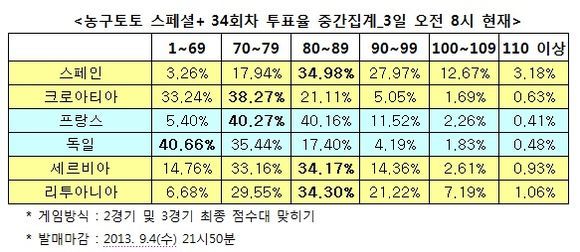 2경기에서는 70~79점대를 기록한 프랑스(40.27%)가 69점 이하(40.66%)를 획득한 독일를 누르고 승리를 챙길 것으로 집계됐다.