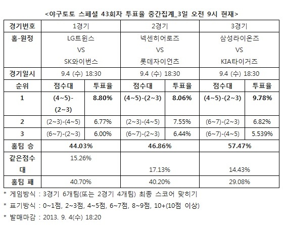 [야구토토] 국민체육진흥공단(www.kspo.or.kr)이 발행하는 체육진흥투표권 수탁사업자인 스포츠토토의 공식 온라인 발매 사이트 베트맨(www.betman.co.kr)이 4일에 열리는 한국프로야구(KBO) 3경기를 대상으로 한 야구토토 스페셜 43회차 투표율을 중간 집계한 결과, 참가자의 46.86%는 넥센-롯데(2경기)전에서 넥센의 승리를 예상했다.