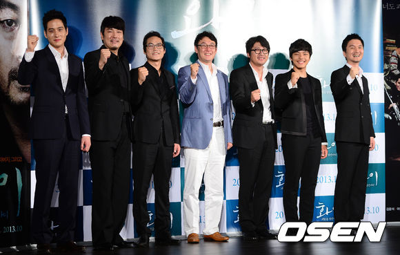 3일 오전 서울 중구 메가박스 동대문에서 열린 영화 '화이 : 괴물을 삼킨 아이' 제작보고회에서 박해준, 조진웅, 김성균, 장준환 감독, 김윤석, 여진구, 장현성이 포토타임을 갖고 있다.