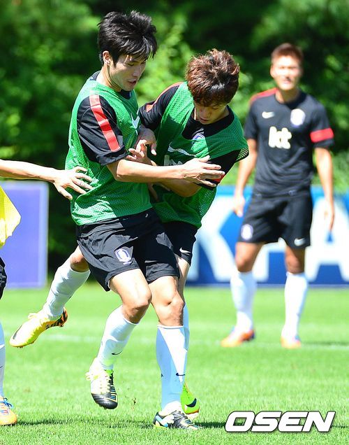 3일 오후 경기도 파주 국가대표 축구 트레이닝 센터(NFC)에서 열린 축구 대표팀 공개훈련에서 이청용과 한국영이 미니게임 중 부딪히고 있다.