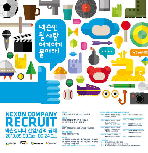 넥슨 컴퍼니가 다음 넥슨인을 모집한다. 게임하이와 네오플, 넥스토릭, 넥슨 등 넥슨 컴퍼니 4개사는 2013년 하반기 신입·경력사원 공개채용을 시작한다고 3일 밝혔다.