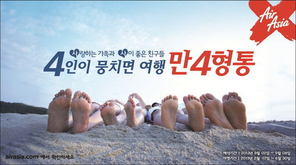이번 특가항공권은 오는 8일까지 에어아시아 웹사이트에서 예약이 가능하며 2014년 2월 17일부터 2014년 6월 30일까지 출발하는 항공편이 해당된다. 모든 프로모션 항공권은 서울 및 부산출발 기준으로 세금을 모두 포함한 4인 기준 편도항공권 요금이다.