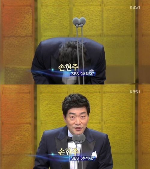 이날 손현주는 "대리수상이다. 지금 '추적자'를 만들었던 조남국 감독은 촬영 중이라 대신 나왔다. 대단히 감사하다는 말을 전해달라고 하더라. 감사합니다"라고 소감을 전하며 90도로 인사해 눈길을 끌었다.