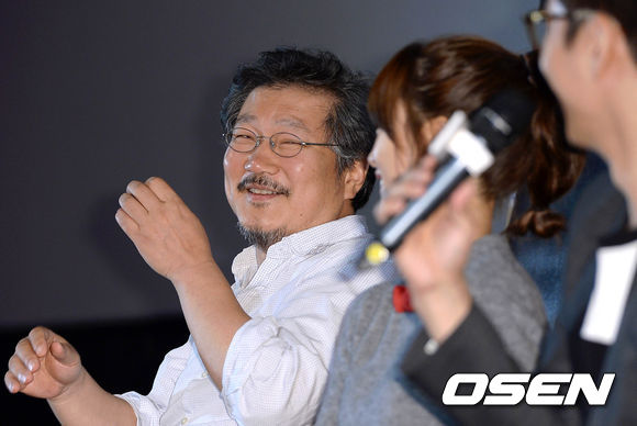홍상수 감독이 배우들을 바라보며 환하게 웃고 있다.