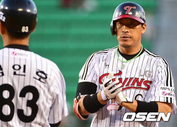 1회말 LG 공격 2사 1, 3루 상황 5번타자 이병규가 선제 1타점 좌전 안타를 날리고 김인호 코치와 인사를 나누고 있다.