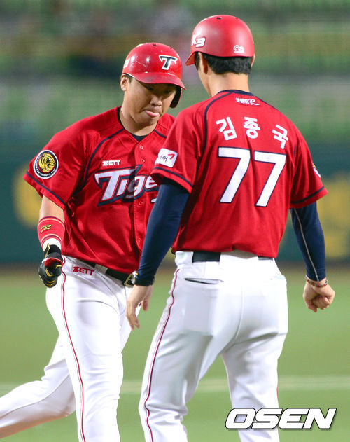 3일 오후 대구구장에서 열린 '2013 한국야쿠르트 세븐 프로야구' 삼성 라이온즈와 KIA 타이거즈의 경기 1회초 1사 1,2루 KIA 이범호가 3점 홈런을 날리고 김종국 코치와 하이파이브를 하고 있다