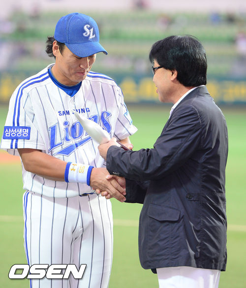 3일 오후 대구구장에서 열린 '2013 한국야쿠르트 세븐 프로야구' 삼성 라이온즈와 KIA 타이거즈의 경기에 앞서 삼성 이승엽이 통산 3000루타 KBO 시상식을 갖고 있다.