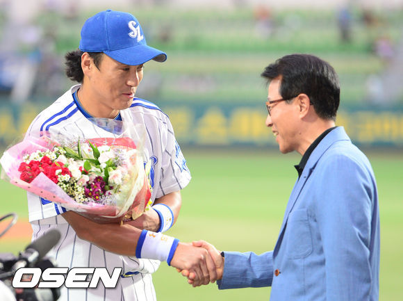 3일 오후 대구구장에서 열린 '2013 한국야쿠르트 세븐 프로야구' 삼성 라이온즈와 KIA 타이거즈의 경기에 앞서 삼성 이승엽이 통산 3000루타 KBO 시상식을 갖고 있다.