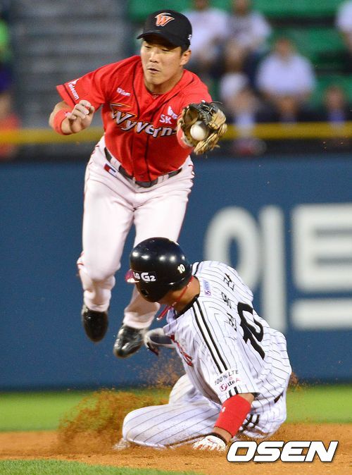 2회말 LG 공격 무사 1루 상황 8번 윤요섭 타석 때 주자 권용관이 2루 도루에 성공하고 있다.