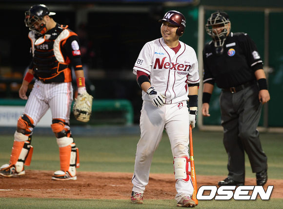 3일 오후 서울 목동구장에서 열린 '2013 한국야쿠르트 세븐 프로야구' 넥센 히어로즈와 롯데 자이언츠의 경기 2회말 1사 허도환이 삼진을 당한 후 미소를 짓고 있다.