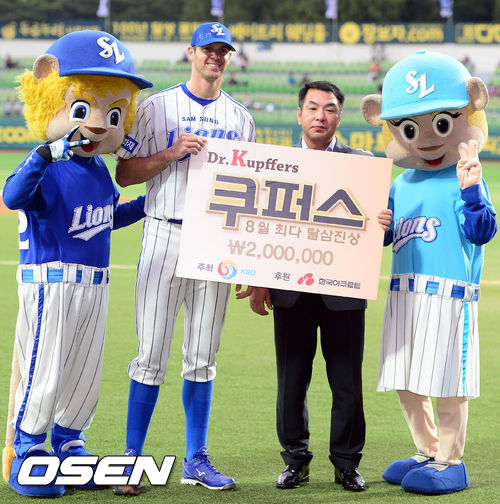 3일 오후 대구구장에서 열린 '2013 한국야쿠르트 세븐 프로야구' 삼성 라이온즈와 KIA 타이거즈의 경기에 앞서 삼성 밴덴헐크가 8월 최다 탈삼진상을 받고 KOB 시상식에서 포즈를 취하고 있다.