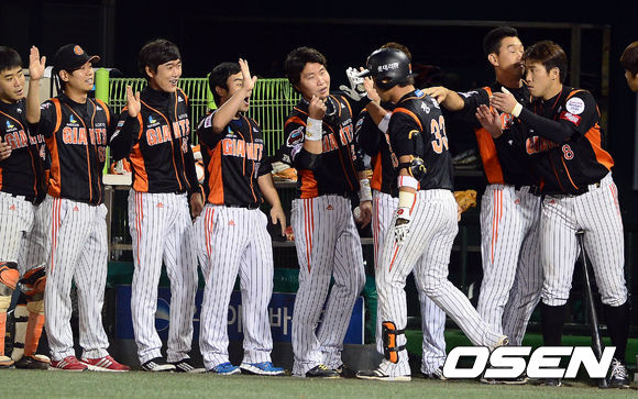 3일 오후 서울 목동구장에서 열린 '2013 한국야쿠르트 세븐 프로야구' 넥센 히어로즈와 롯데 자이언츠의 경기 3회초 1사 정훈이 솔로포를 친 후 동료들과 하이파이브를 하고 있다.