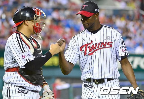 3회초 SK 공격 2사 2, 3루 상황 3번타자 최정을 외야 플라이로 이끌며 무실점으로 이닝을 막아낸 LG 선발 리즈와 포수 윤요섭이 인사를 나누고 있다.