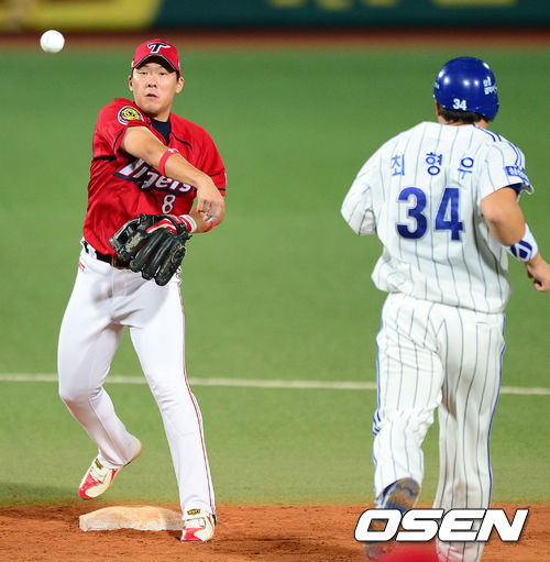 3일 오후 대구구장에서 열린 '2013 한국야쿠르트 세븐 프로야구' 삼성 라이온즈와 KIA 타이거즈의 경기, 4회말 무사 1루 삼성 이승엽의 내야땅볼을 KIA 2루수 안치홍이 1루 주자 최형우를 포스아웃시키고 병살시도하고 있다. 타자 이승엽도 아웃.