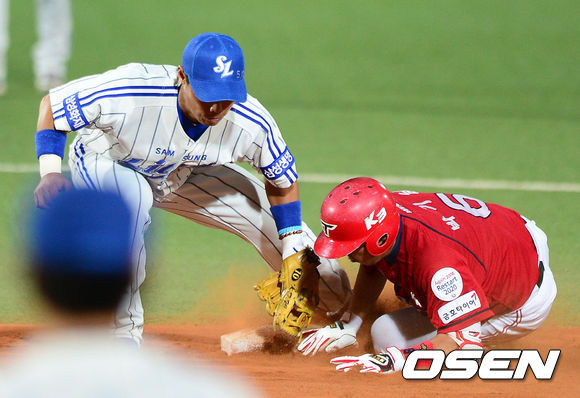 3일 오후 대구구장에서 열린 '2013 한국야쿠르트 세븐 프로야구' 삼성 라이온즈와 KIA 타이거즈의 경기, 6회초 무사 1루 KIA 박기남이 2루타를 날리고 2루에 세이프되고 있다