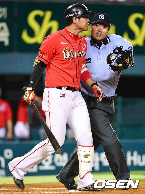 7회초 SK 공격 2사 주자없는 상황 3번타자 최정이 LG 선발 리즈의 공에 몸을 맞은 뒤 강하게 어필하고 있다. 이를 제지하는 박근영 주심.