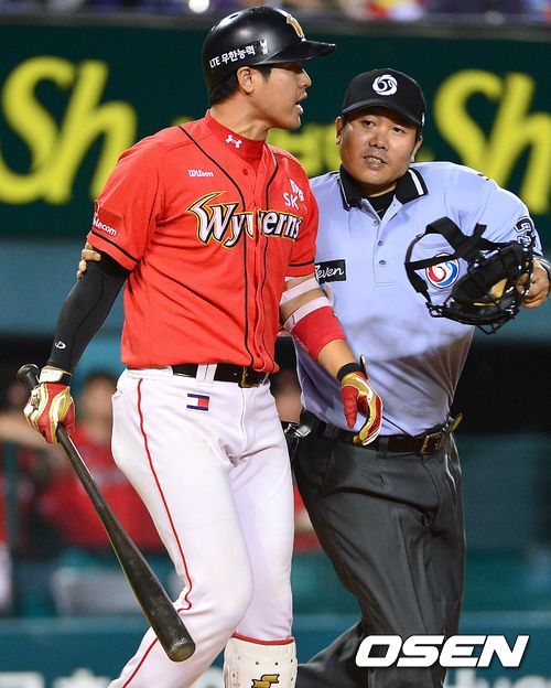 7회초 SK 공격 2사 주자없는 상황 3번타자 최정이 LG 선발 리즈의 공에 몸을 맞은 뒤 강하게 어필하고 있다. 이를 제지하는 박근영 주심.