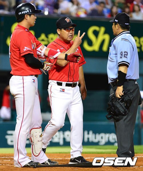 7회초 SK 공격 2사 주자없는 상황 3번타자 최정이 LG 선발 리즈의 공에 몸을 맞았다. 이에 심판진을 향해 강력하게 항의하고 있는 SK 이만수 감독.