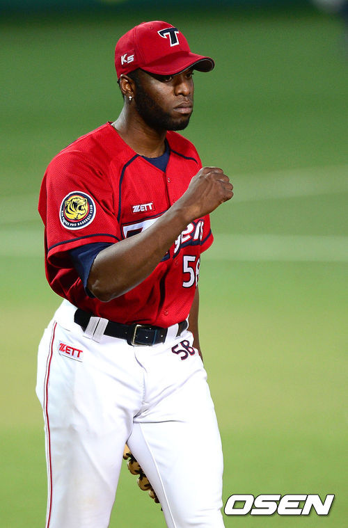 3일 오후 대구구장에서 열린 '2013 한국야쿠르트 세븐 프로야구' 삼성 라이온즈와 KIA 타이거즈의 경기, 7회말 삼성 선두타자 박한이에게 안타를 허용했지만 3타자를 범타 시킨 KIA 소사가 주먹을 쥐며 환호하고 있다