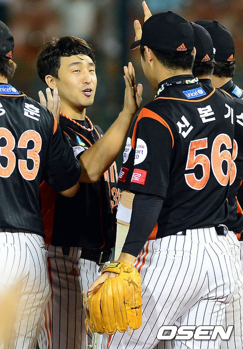3일 오후 서울 목동구장에서 열린 '2013 한국야쿠르트 세븐 프로야구' 넥센 히어로즈와 롯데 자이언츠의 경기 종료 후 손아섭이 동료들과 하이파이브를 하고 있다.