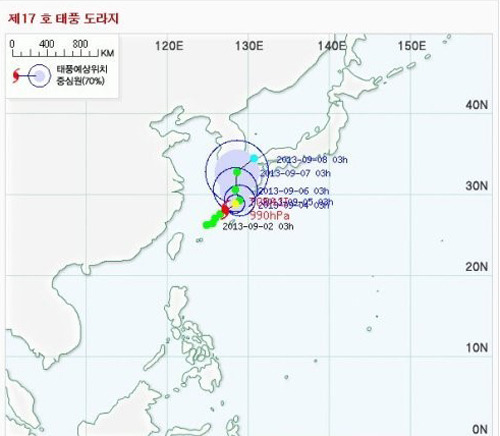 기상청은 “일본 오키나와 부근 해상에서 북상 중인 17호 태풍 ‘도라지’의 영향으로 6일 전국적으로 비가 내릴 것이다”라고 밝혔다.