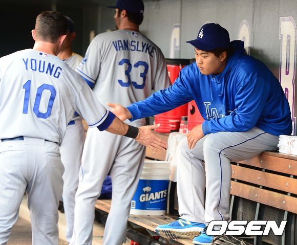 4일 (이하 한국시간) 미국 콜로라도주 덴버 쿠어스 필드에서 열린 2013 메이저리그 콜로라도 로키스와 LA 다저스의 경기, 경기 전 덕아웃에서 다저스 류현진이 마이클 영과 하이파이브를 하고 있다.