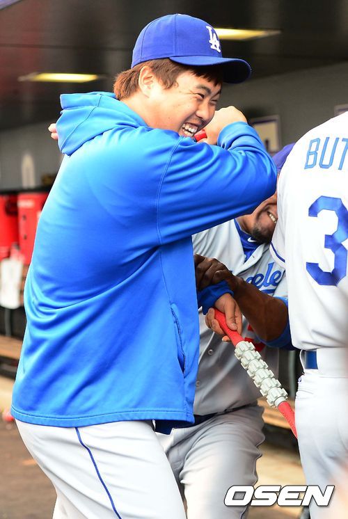 4일 (이하 한국시간) 미국 콜로라도주 덴버 쿠어스 필드에서 열린 2013 메이저리그 콜로라도 로키스와 LA 다저스의 경기, 덕아웃에서 류현진과 유리베가 장난을 치고 있다.