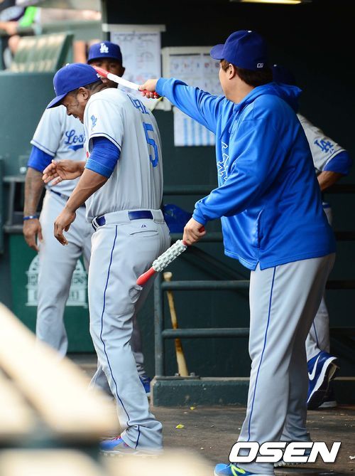 4일 (이하 한국시간) 미국 콜로라도주 덴버 쿠어스 필드에서 열린 2013 메이저리그 콜로라도 로키스와 LA 다저스의 경기, 덕아웃에서 류현진과 유리베가 장난을 치고 있다.