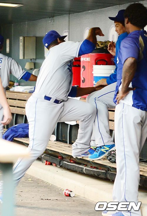 4일 (이하 한국시간) 미국 콜로라도주 덴버 쿠어스 필드에서 열린 2013 메이저리그 콜로라도 로키스와 LA 다저스의 경기, 류현진과 유리베가 덕아웃에서 장난을 치고 있다.