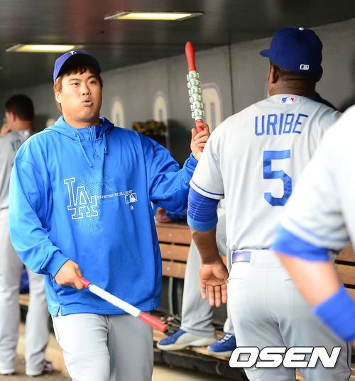 4일 (이하 한국시간) 미국 콜로라도주 덴버 쿠어스 필드에서 열린 2013 메이저리그 콜로라도 로키스와 LA 다저스의 경기, 류현진과 유리베가 덕아웃에서 장난을 치고 있다.