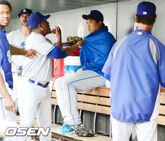 4일 (이하 한국시간) 미국 콜로라도주 덴버 쿠어스 필드에서 열린 2013 메이저리그 콜로라도 로키스와 LA 다저스의 경기, 류현진과 유리베가 덕아웃에서 장난을 치고 있고, 이 모습을 돈 매팅리 감독(오른쪽)이 지켜보고 있다.