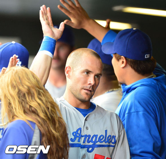 4일 (이하 한국시간) 미국 콜로라도주 덴버 쿠어스 필드에서 열린 2013 메이저리그 콜로라도 로키스와 LA 다저스의 경기, 2회초 2사 주자 2,3루 다저스 크로포드의 좌전 2타점 적시타때 홈을 밟은 슈마커가 덕아웃에서 류현진과 하이파이브를 하고 있다.