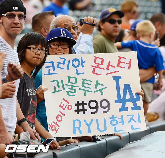 4일 (이하 한국시간) 미국 콜로라도주 덴버 쿠어스 필드에서 열린 2013 메이저리그 콜로라도 로키스와 LA 다저스의 경기, 한인 팬들이 류현진을 응원하고 있다.